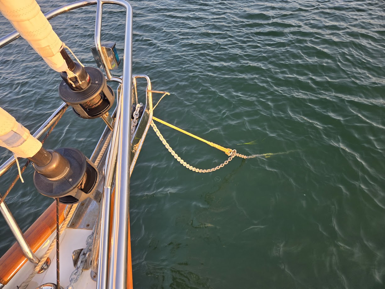 Bigger boats with all chain will normally deploy some sort of snubber line. This consists of a length of pretty beefy rope with some sort of chain hook on the end. You will also often see this in a bridal setup where there are two lengths of rope with the chain hook in the middle. The rope end(s) then connect to cleats the same way a mooring line would. The idea of this setup, is that the snubber carries all the tension of the anchor rode instead of putting that constant load on the windlass. It also adds a bit more elasticity to the system as you would typically use three-strand nylon for the rope(s). We do a single 30 foot line of 3/4″ nylon with an eye splice to our chain hook. This is a seriously heavy-duty setup and has been stretched like a guitar string more than once!